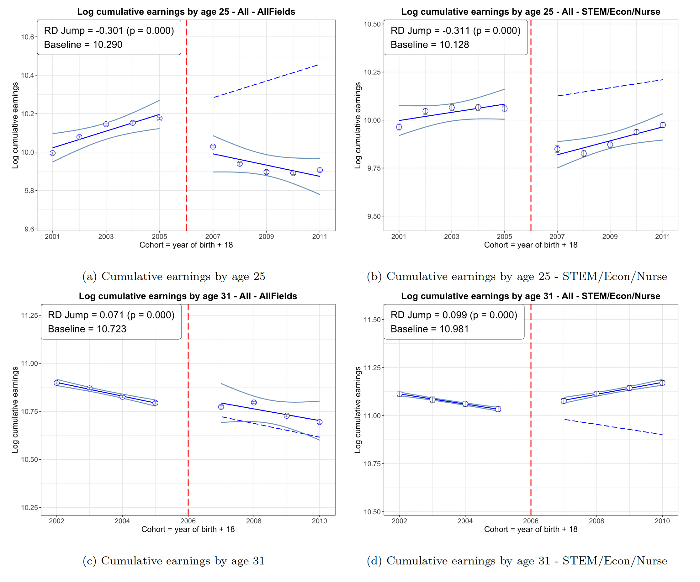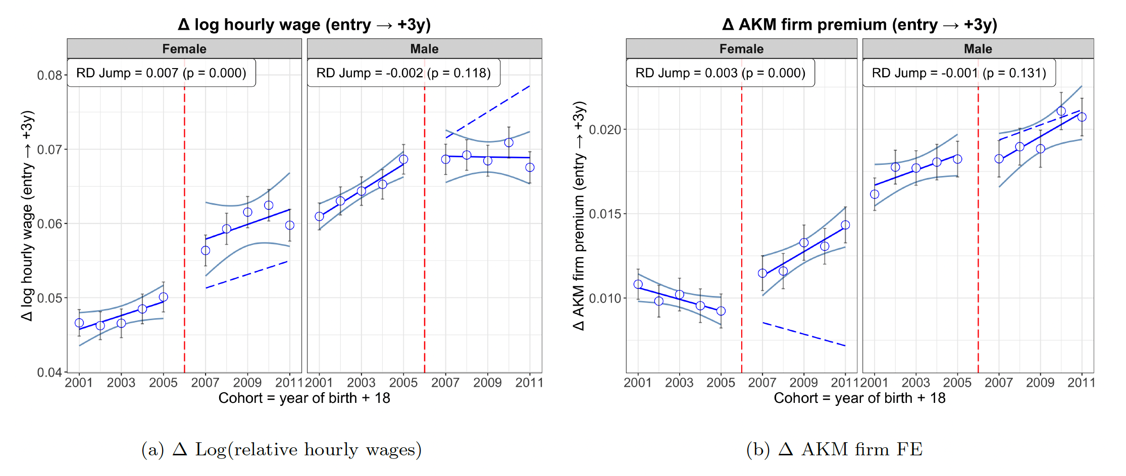 Relative hourly wages rise by 3.8% at the cutoff (4.2% for women; 3.3% for men). Back-of-the-envelope calculations using the schooling proxies imply returns per additional year of education in the 10–15% range. A decomposition using an AKM model with individual, firm, and occupation effects shows that 66% of the wage gain is an individual component purged of sorting, 24% operates through firm sorting, while the occupation component is negligible. Cumulative earnings are lower in the mid-20s, highlighting foregone earnings as more students study, but turn positive by the early 30s.