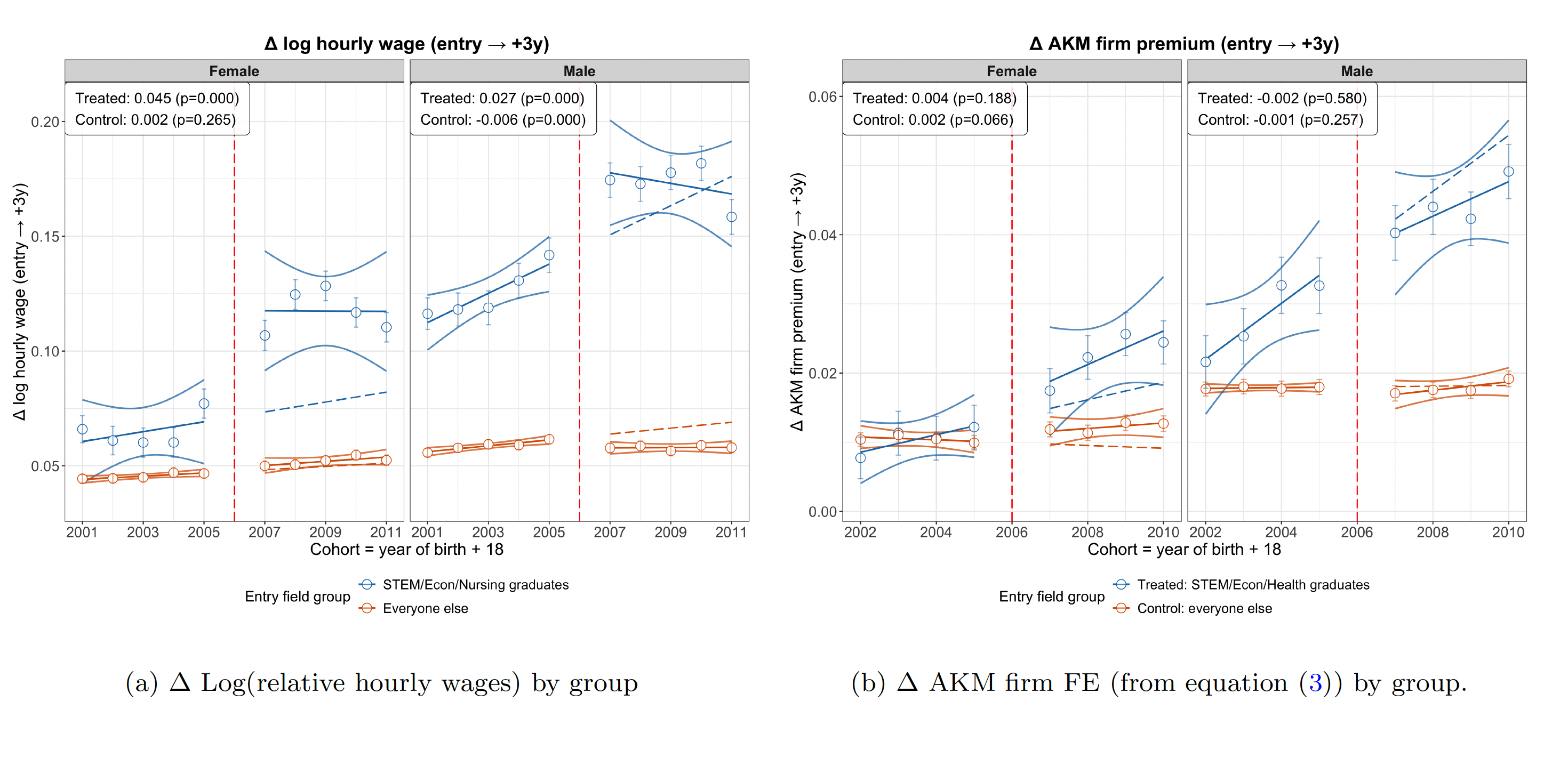 Patterns are similar by gender, yet women catch up through faster growth. Post-reform women are more likely to transition into higher-paying firms in the first years after graduation and exhibit steeper early-career wage growth.